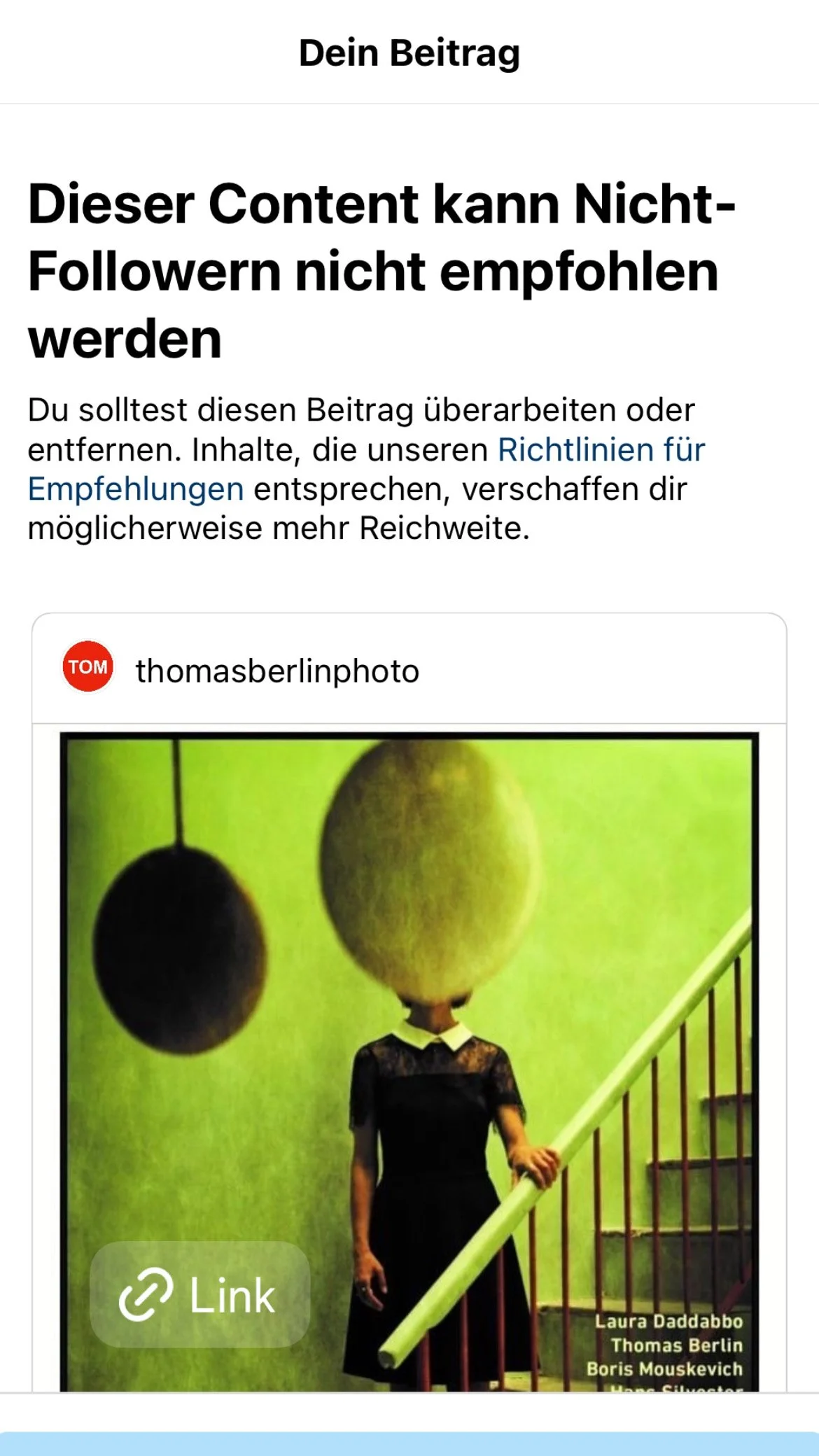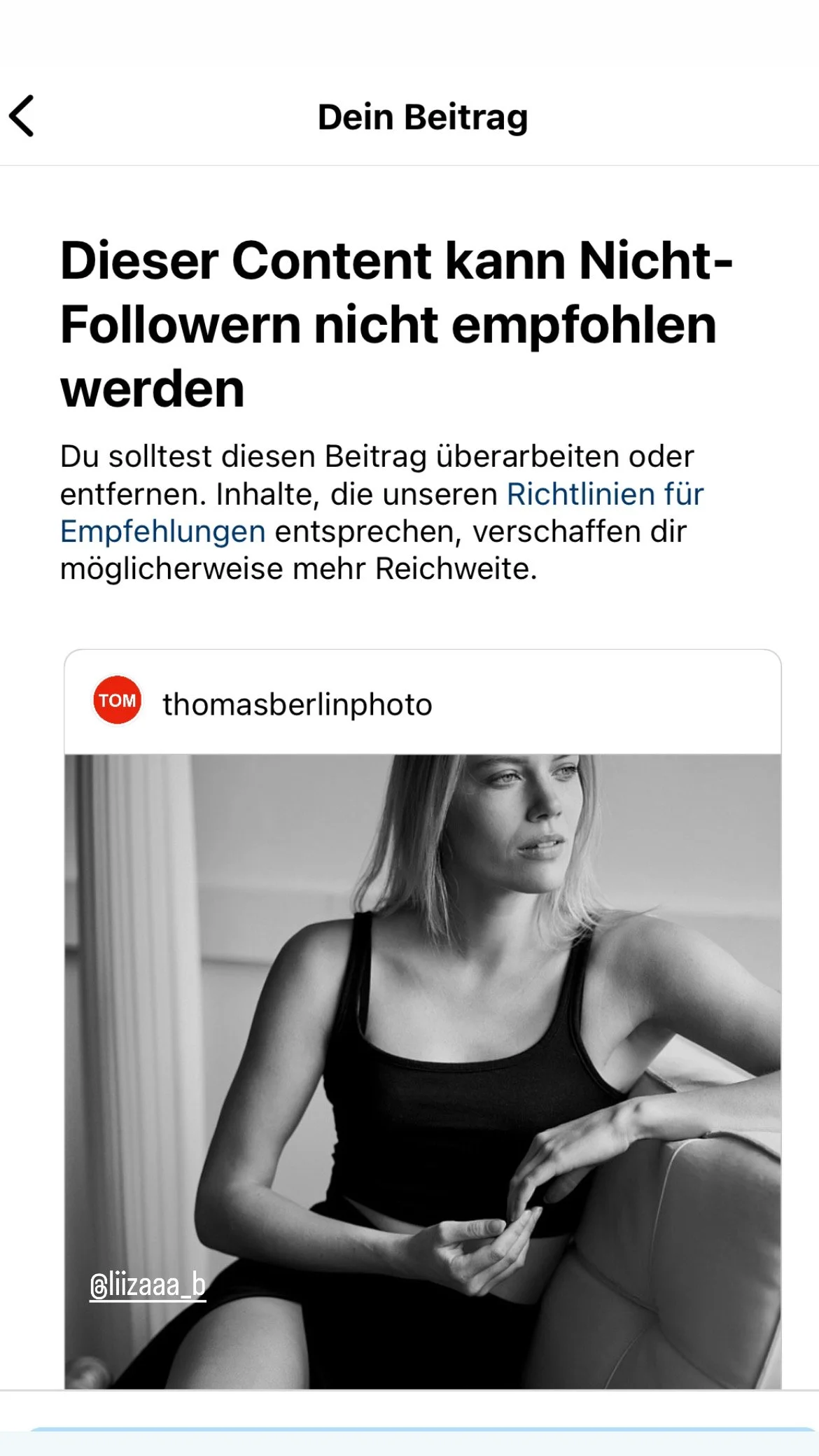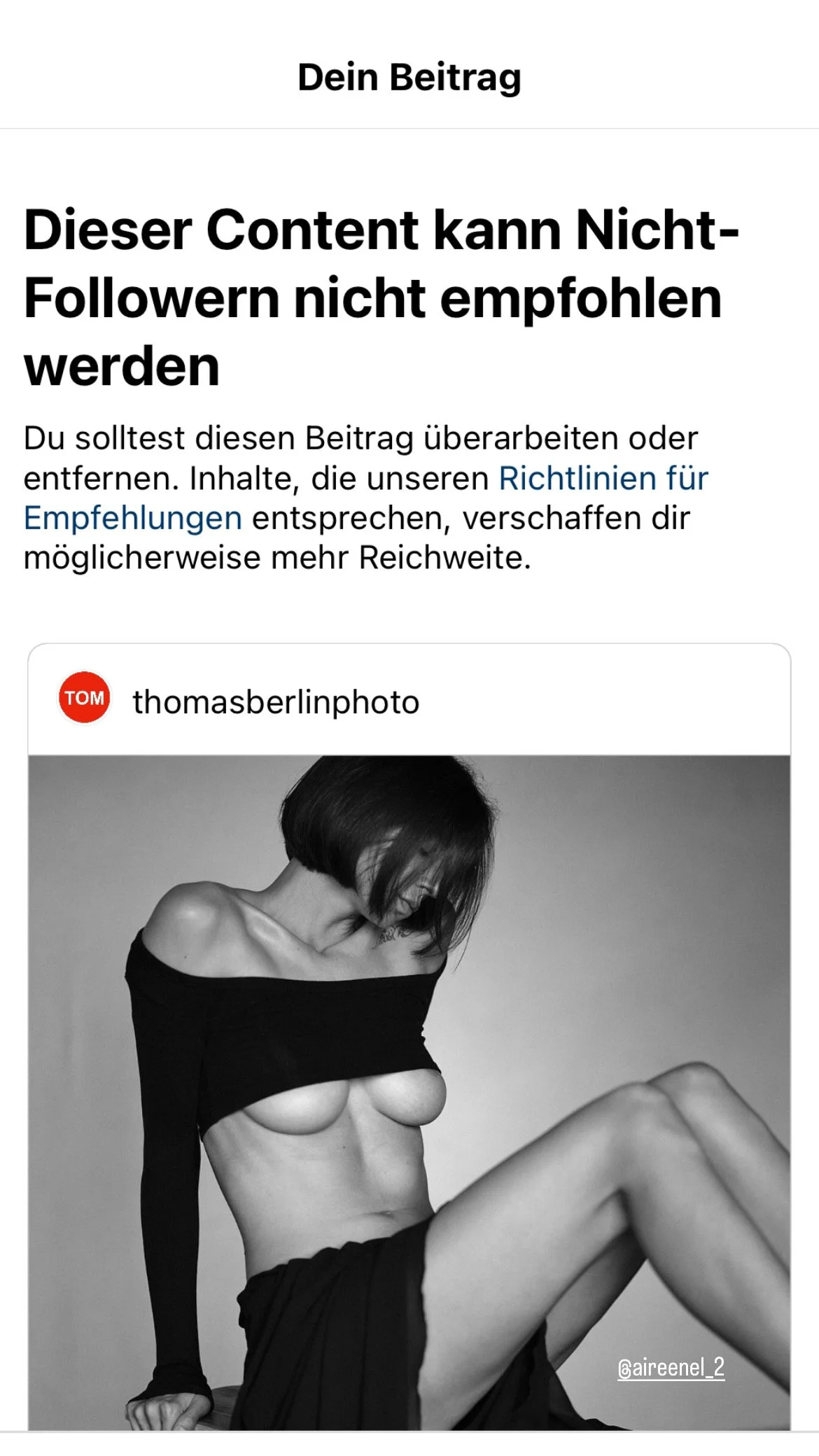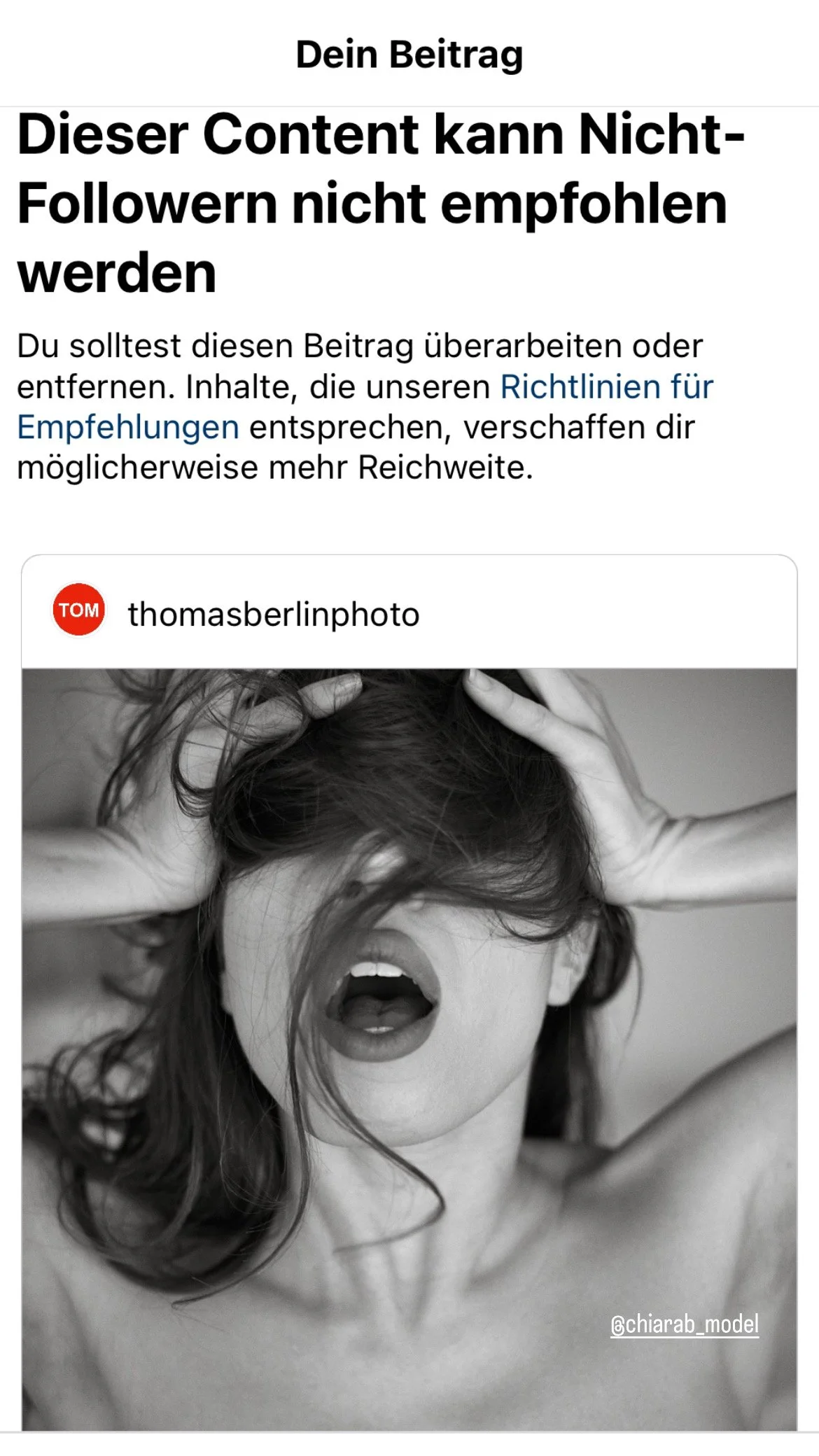 “Instagram löscht manche Bilder nicht, schränkt manchmal aber die Reichweite ein. D.h. die Bilder sind für Nichtfollower nicht mehr sichtbar. Bei mehreren unliebsamen Bildern kann auch das ganze Konto “unsichtbar” geschaltet werden.”